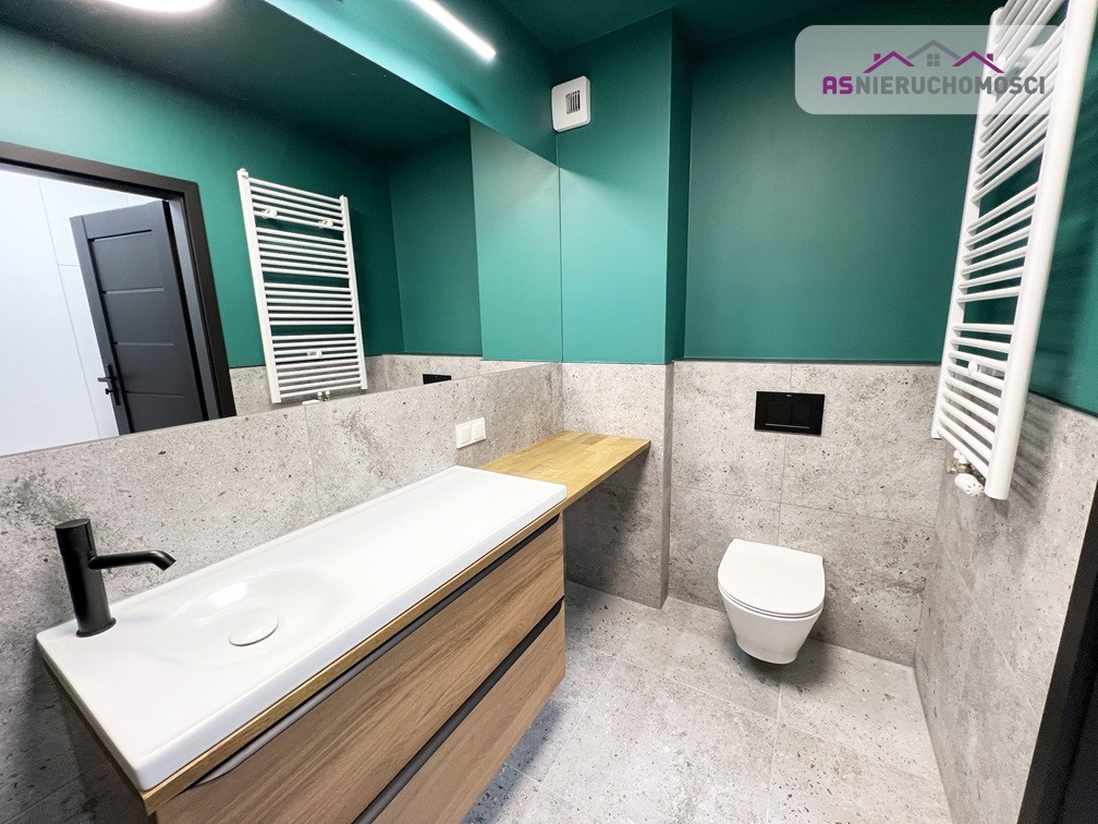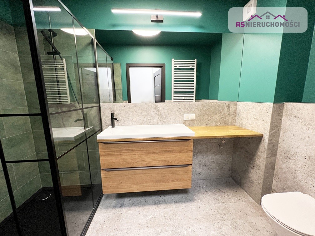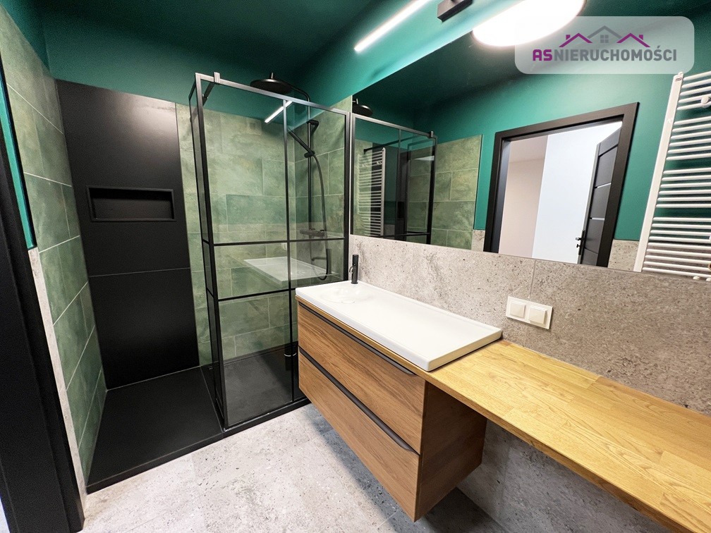 Łazienka wykończona w eleganckim stylu, kabina typu Walk in, podwieszane wc, meble łazienkowe wykonane na specjalne zamówienie, umywalka nablatowa. W całym apartamencie nowoczesne, DESIGNERSKIE oświetlenie.