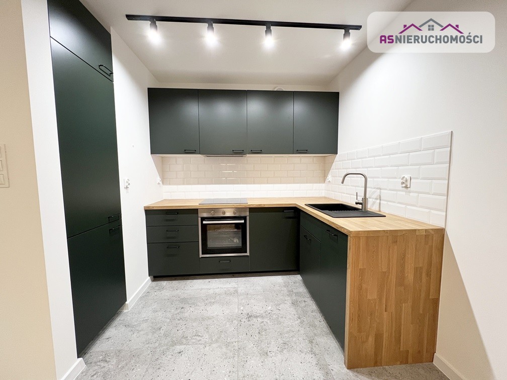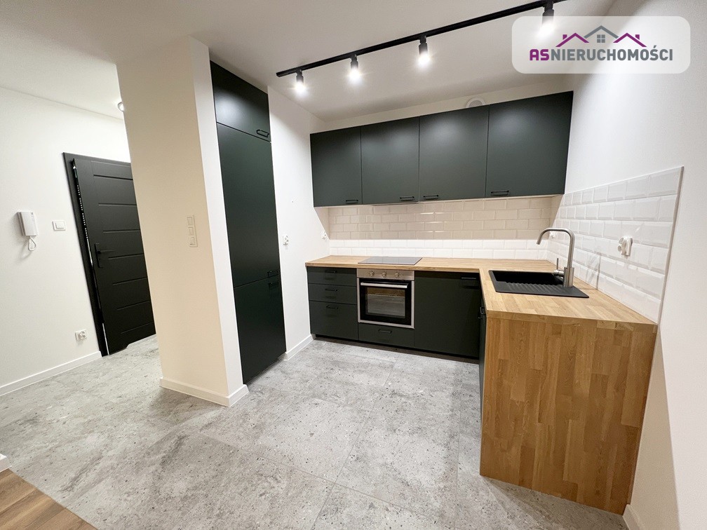 W aneksie kuchennym meble wykonane na INDYWIDUALNE zamówienie oraz nowoczesny sprzęt AGD: piekarnik, płyta indukcyjna, zmywarka i lodówka.