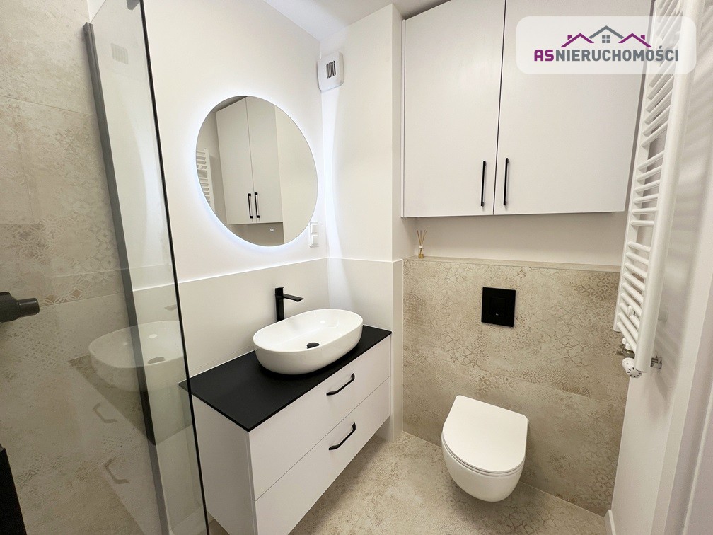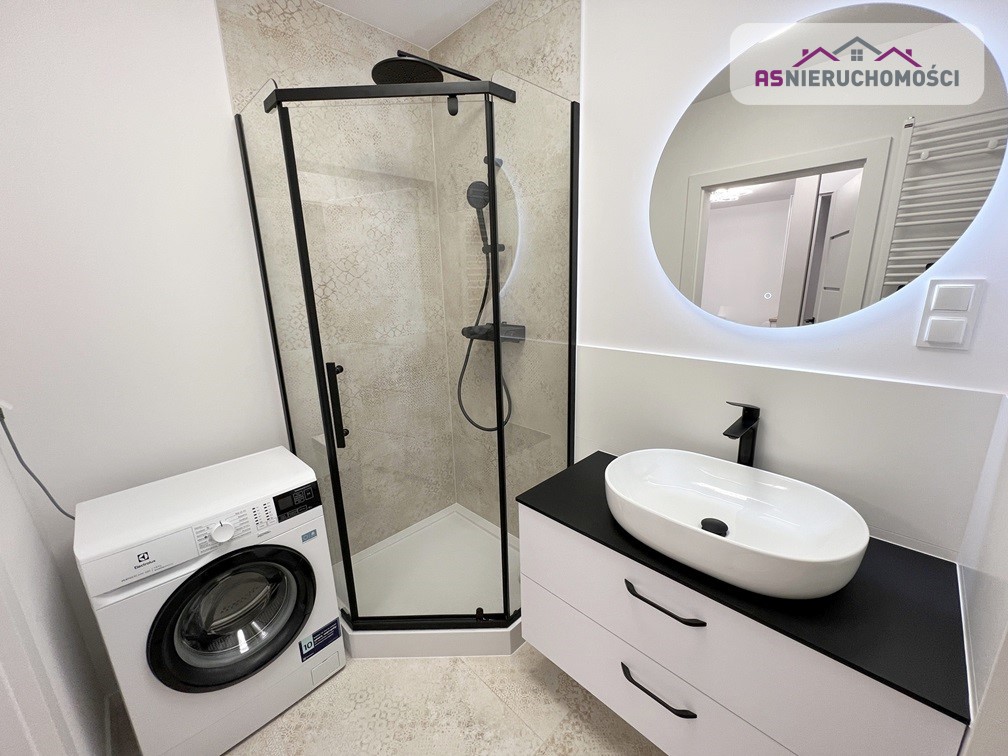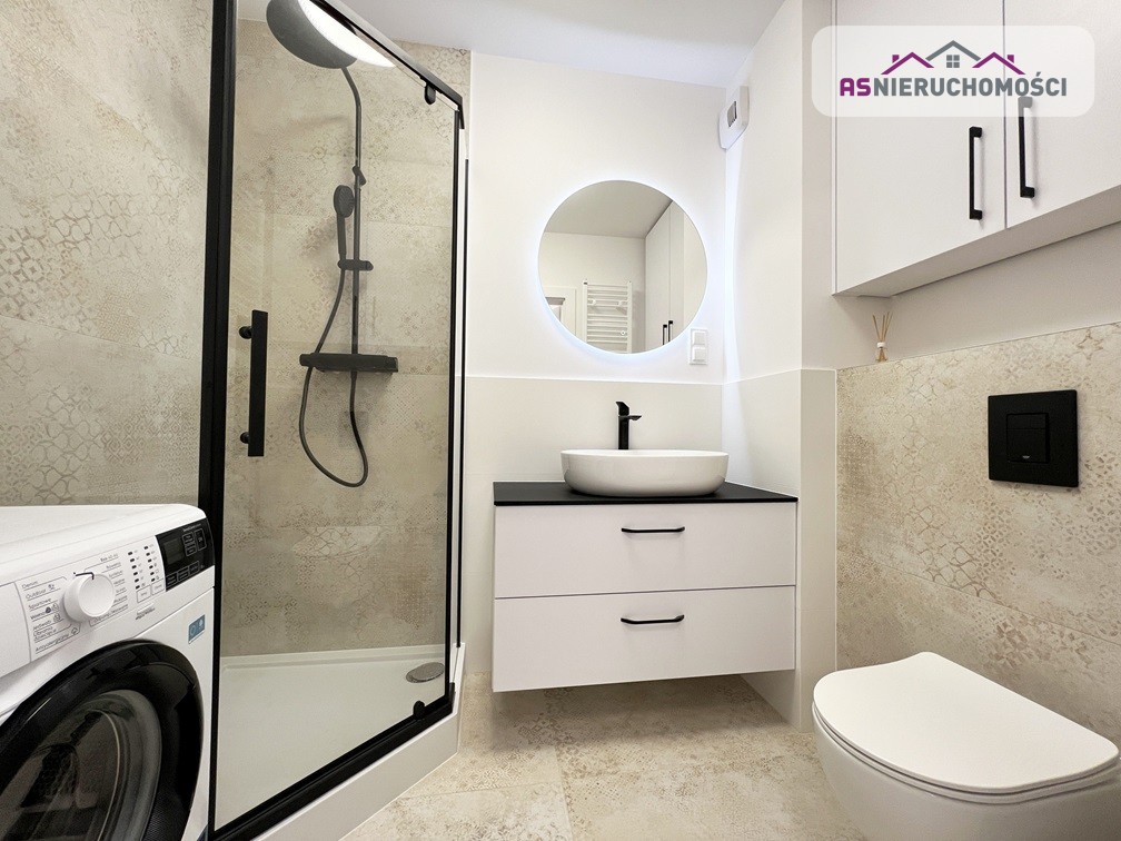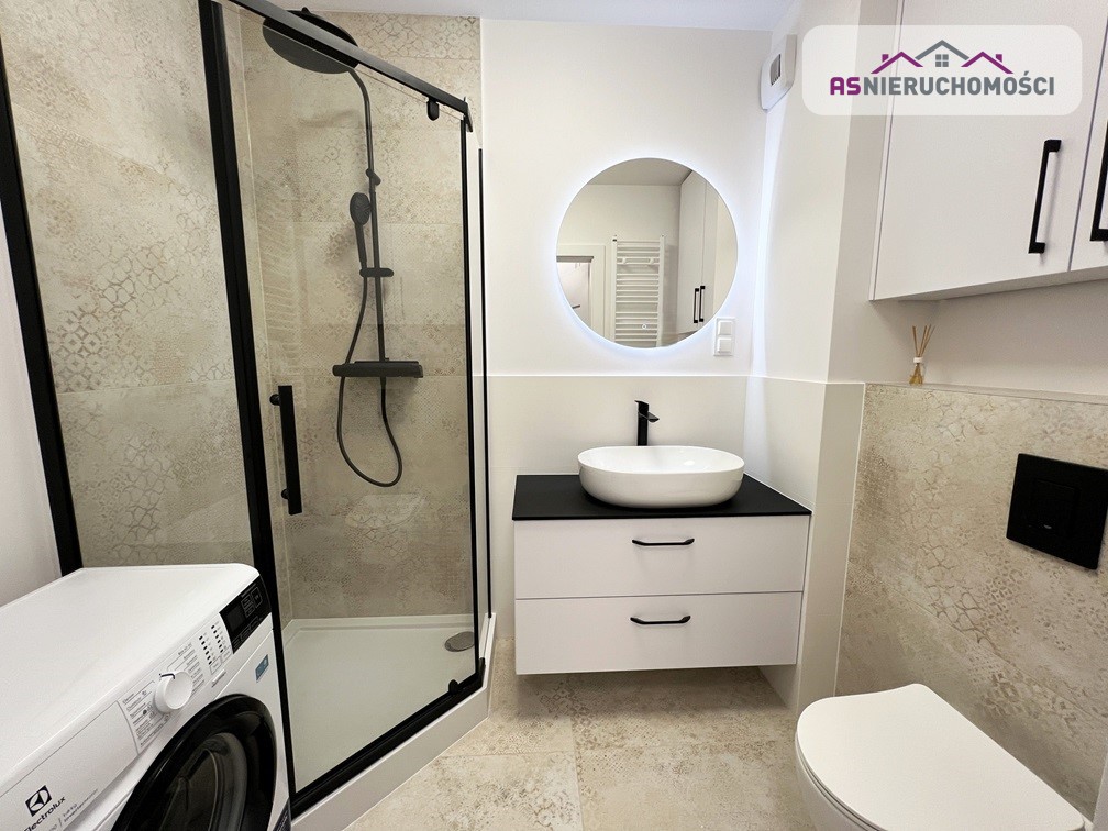 Łazienka wykończona w eleganckim stylu, kabina prysznicowa, podwieszane wc, meble łazienkowe wykonane na specjalne zamówienie, umywalka nablatowa, pralka. W całym apartamencie nowoczesne, DESIGNERSKIE oświetlenie.